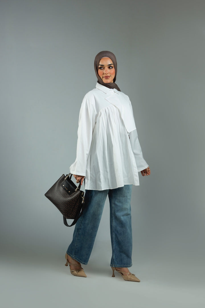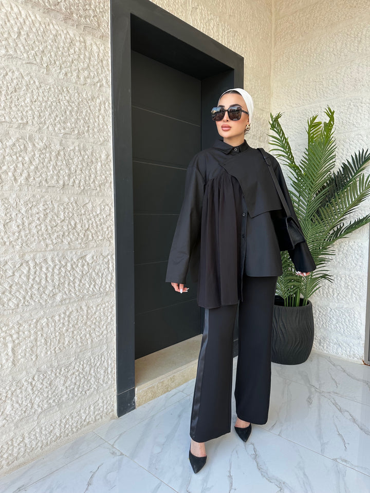 قميص عصري بأزرار أمامية وتصميم بطبقات غير متناظرة في الجزء الأمامي، يمنح لمسة حديثة وأنيقة بأسلوب متجدّد.