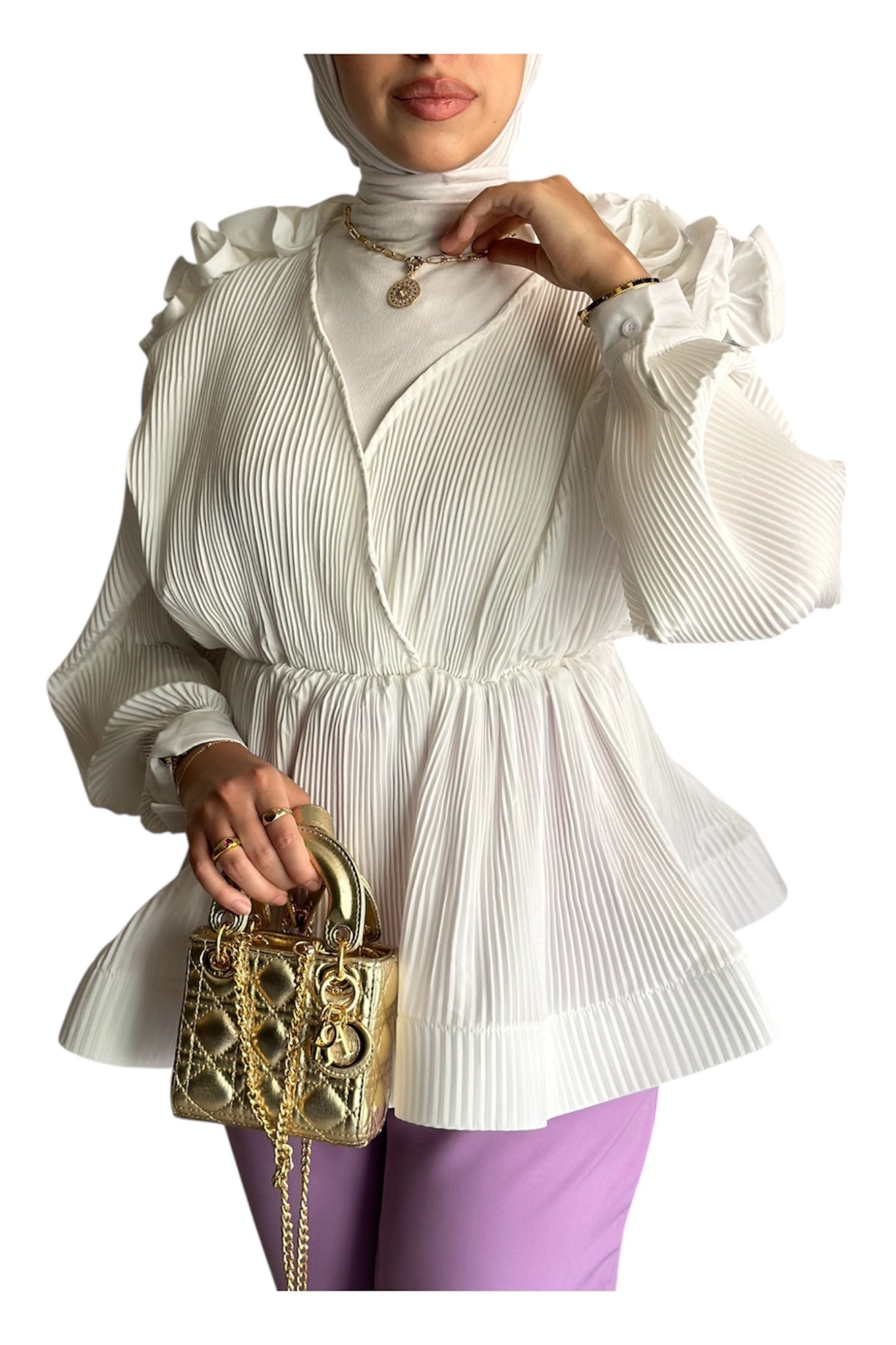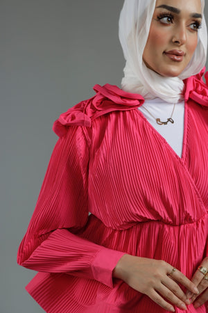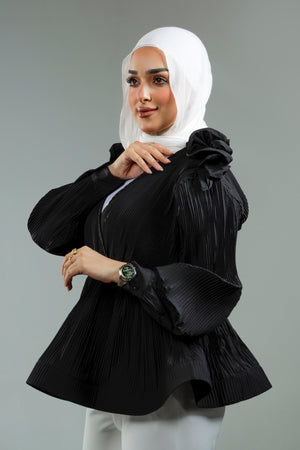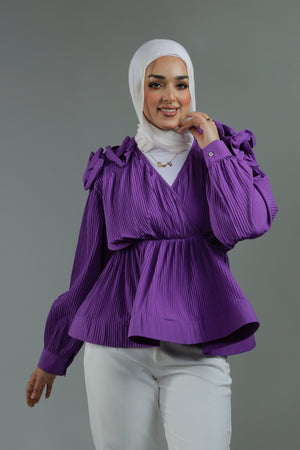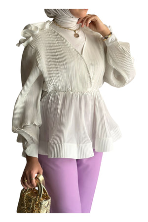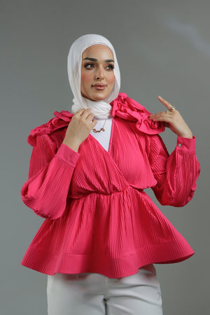 Pleated wrap shirt featuring playful ruffles and stylish puff sleeves.
