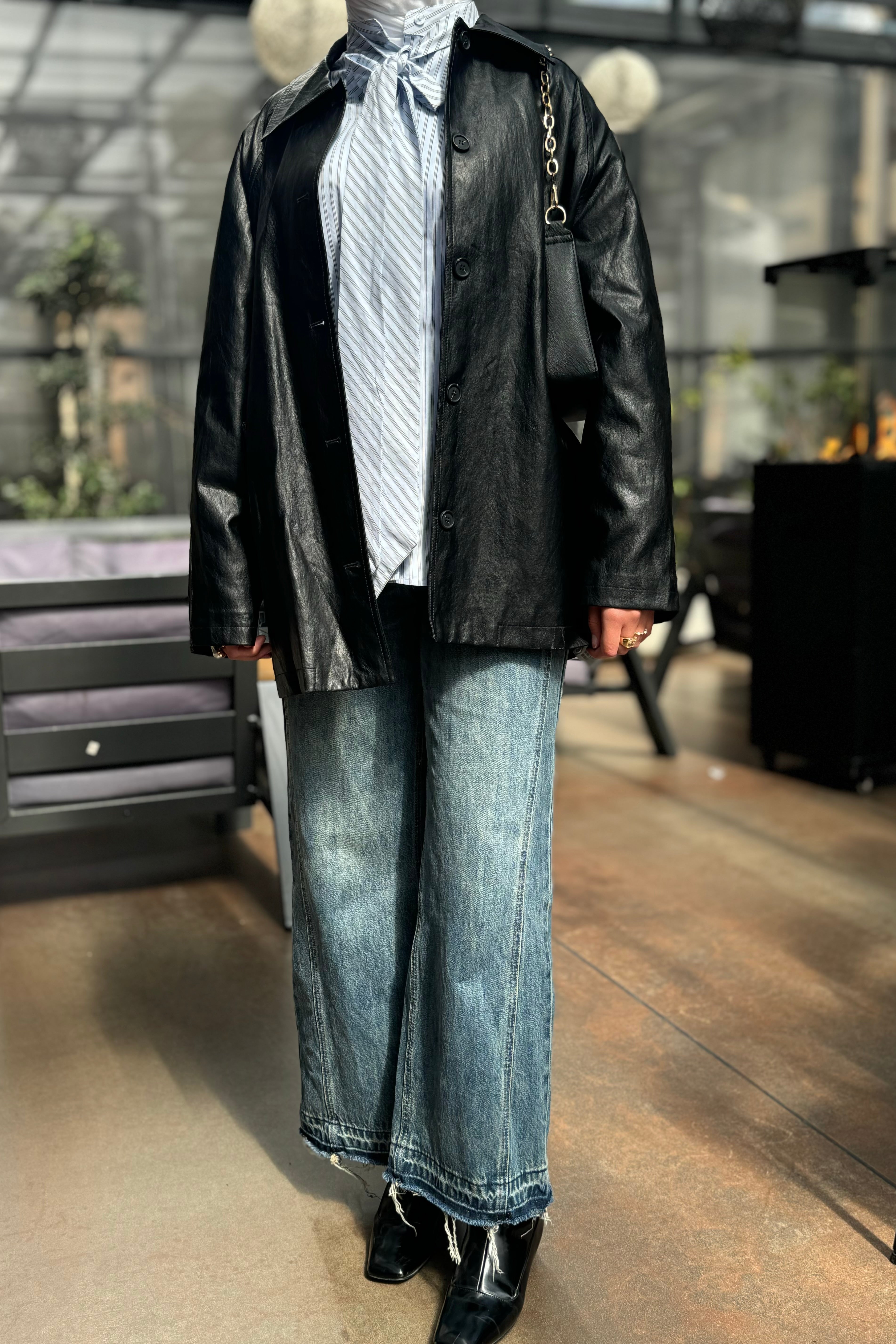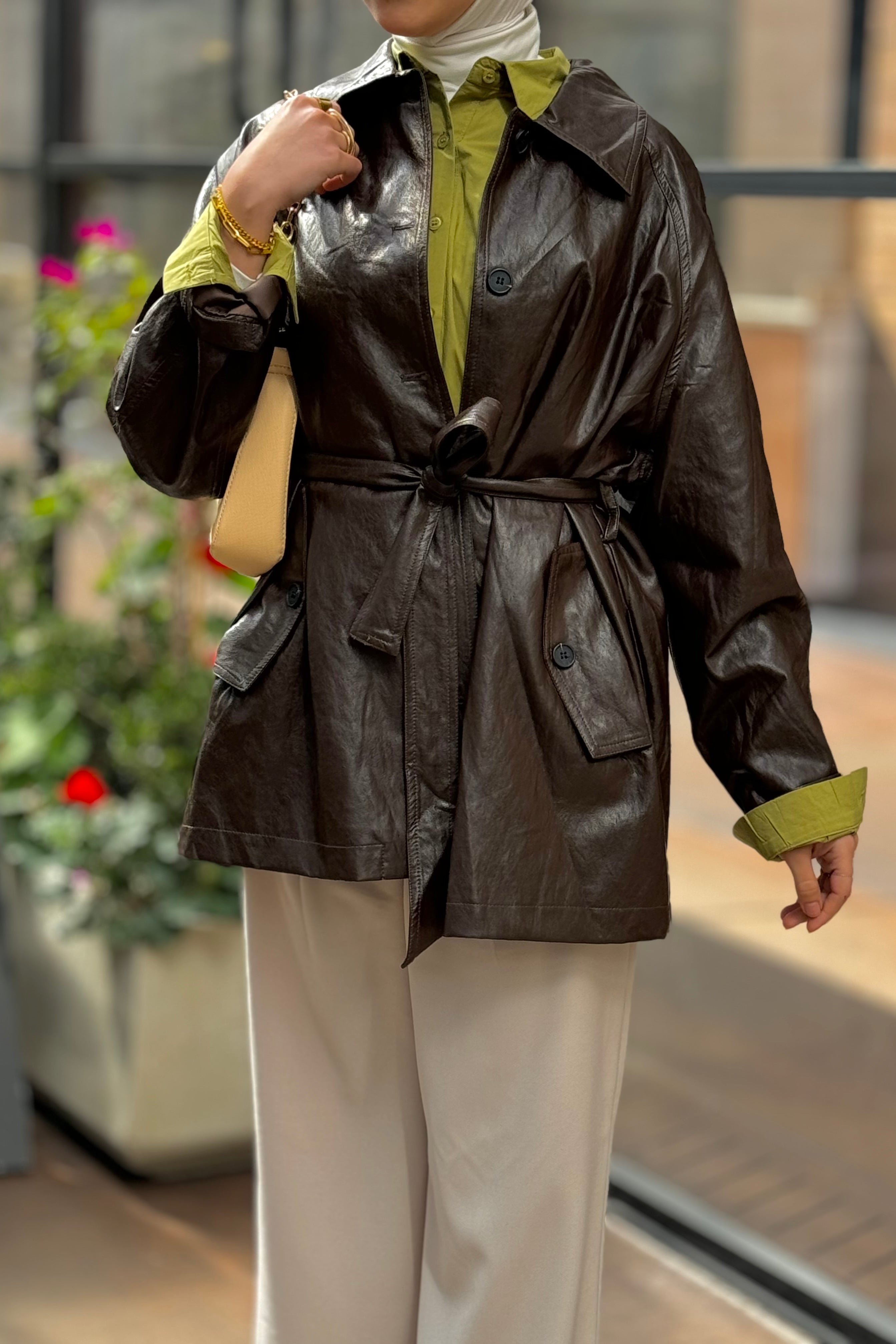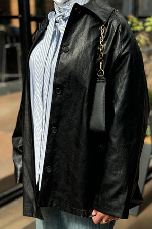 stylish faux leather jacket with a belted waist and relaxed fit, offering a chic and modern look for any occasion