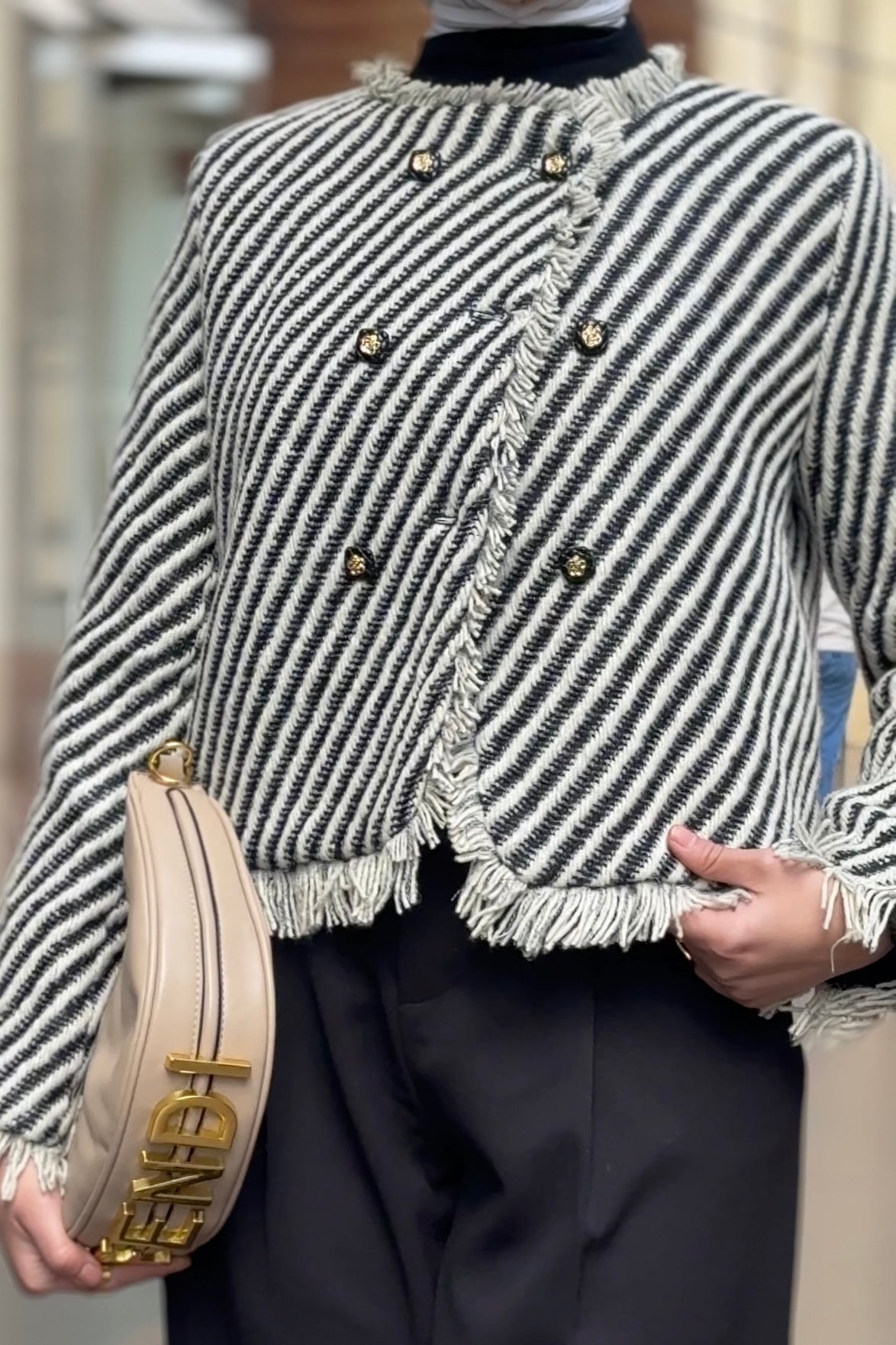 Chic cropped jacket with bold stripes, fringe edges, and gold button details for a modern, stylish look.