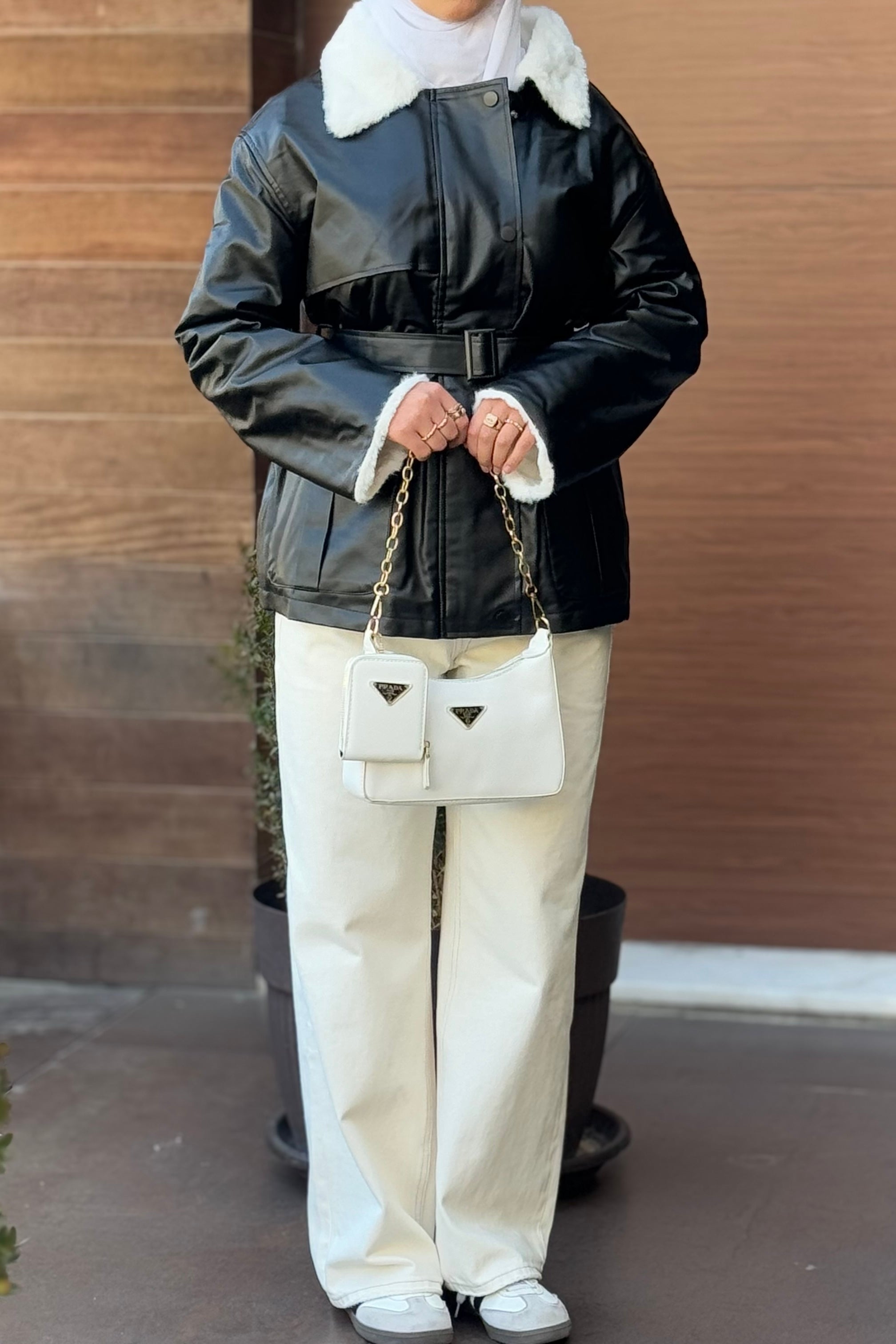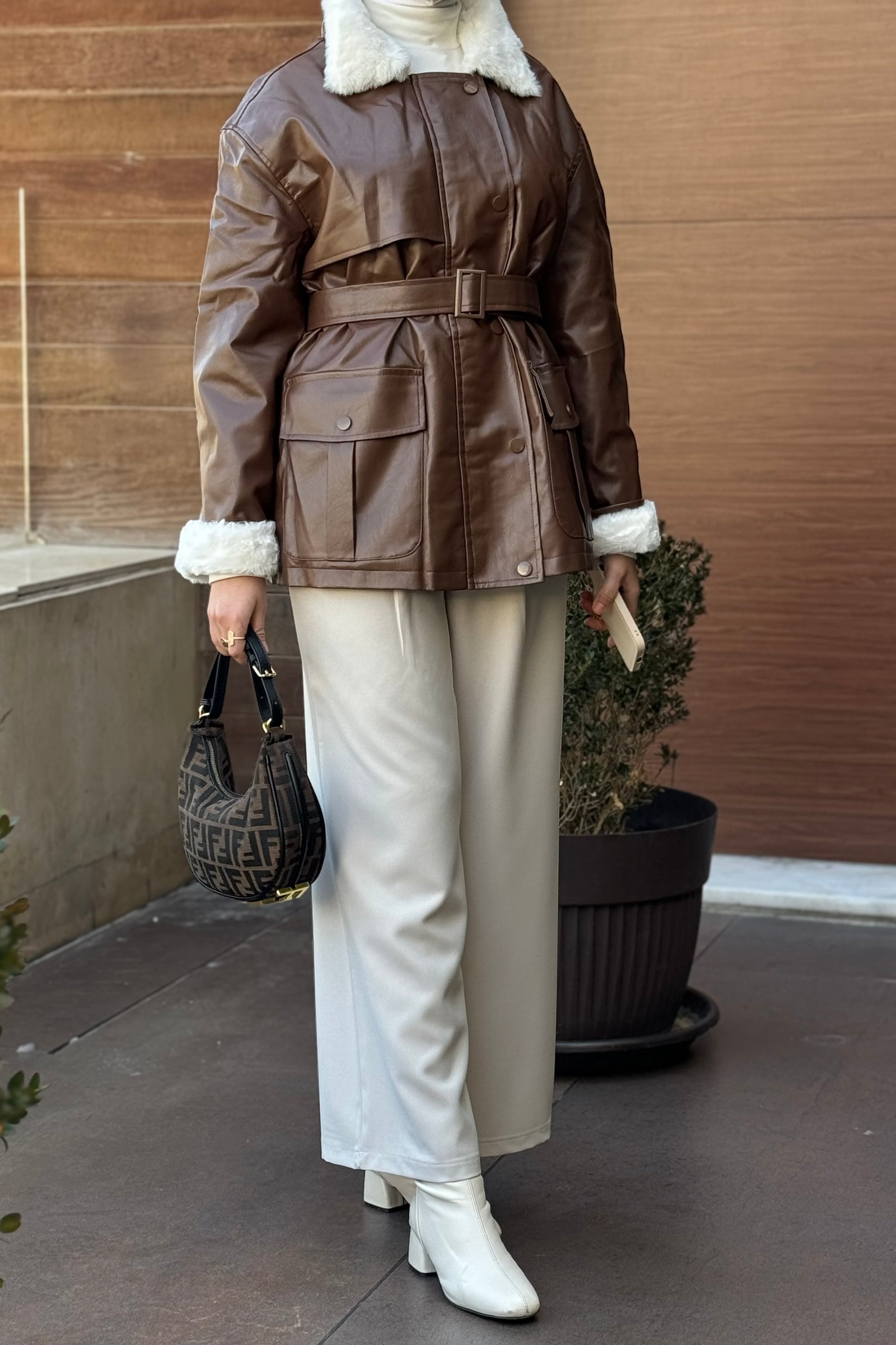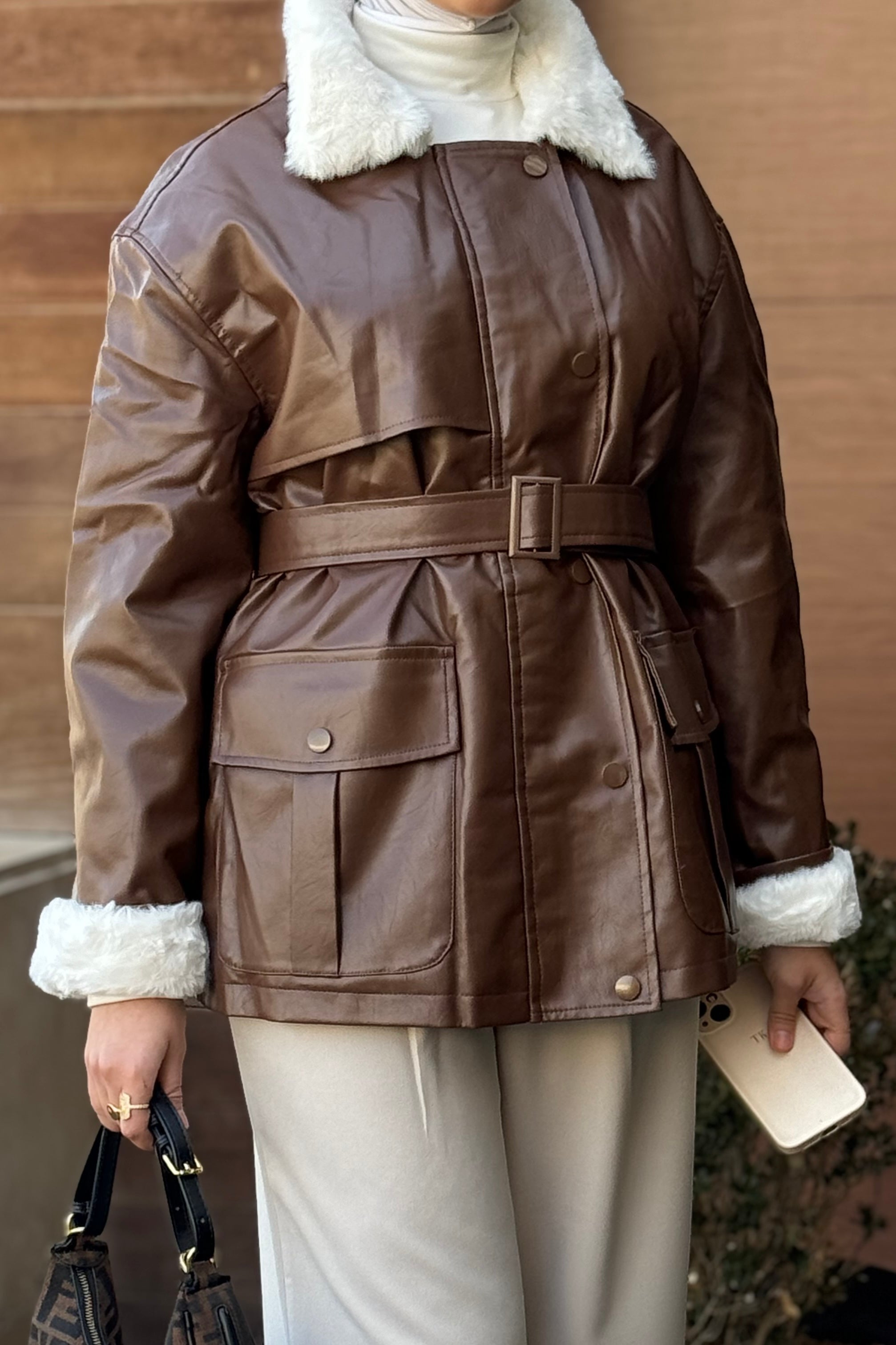 Chic belted faux leather jacket with a soft shearling collar and cuffs. Features front flap pockets and a structured silhouette for a modern, elegant look.