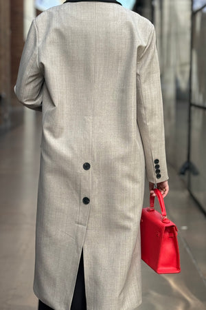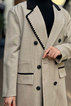 Elegant double-breasted long coat with contrast trim and structured silhouette for a refined, timeless look