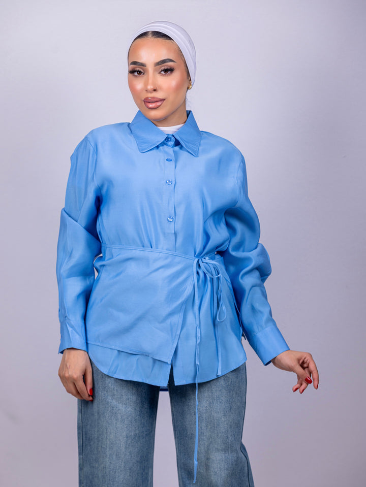 A chic button-down shirt with a wrap-around tie detail at the waist, combining classic elegance with a modern touch