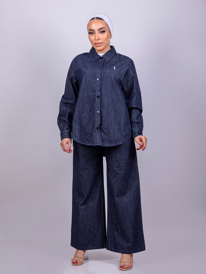 A chic and versatile denim set featuring a button-down top with a flattering waist belt and wide-leg pants. Perfect for a modern modest look that blends comfort with timeless style