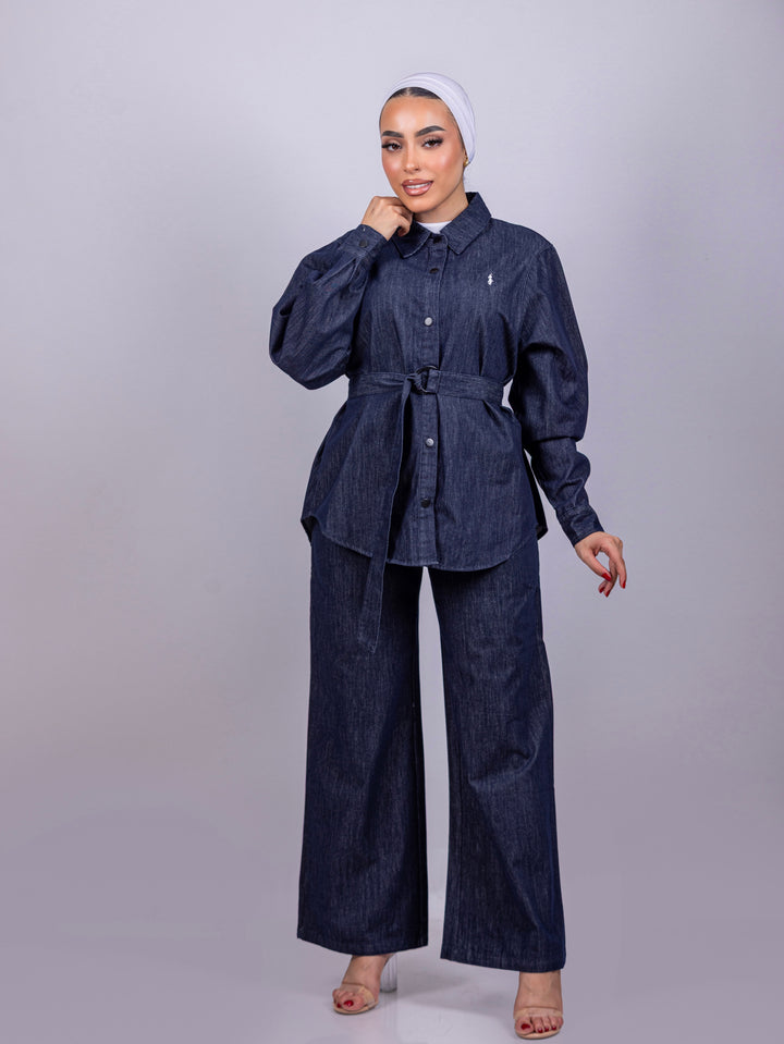 Chic denim set featuring a button-down shirt with a classic collar and a waist tie belt for a flattering fit.