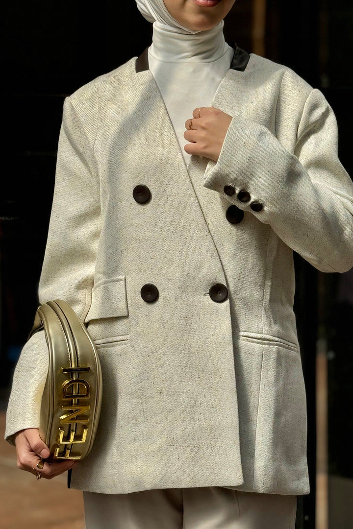 Chic double-breasted blazer with fabric front and faux leather back for a bold, elegant look.