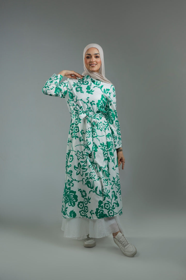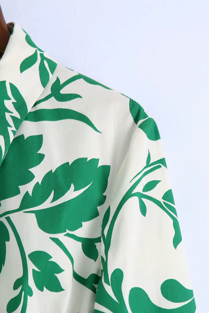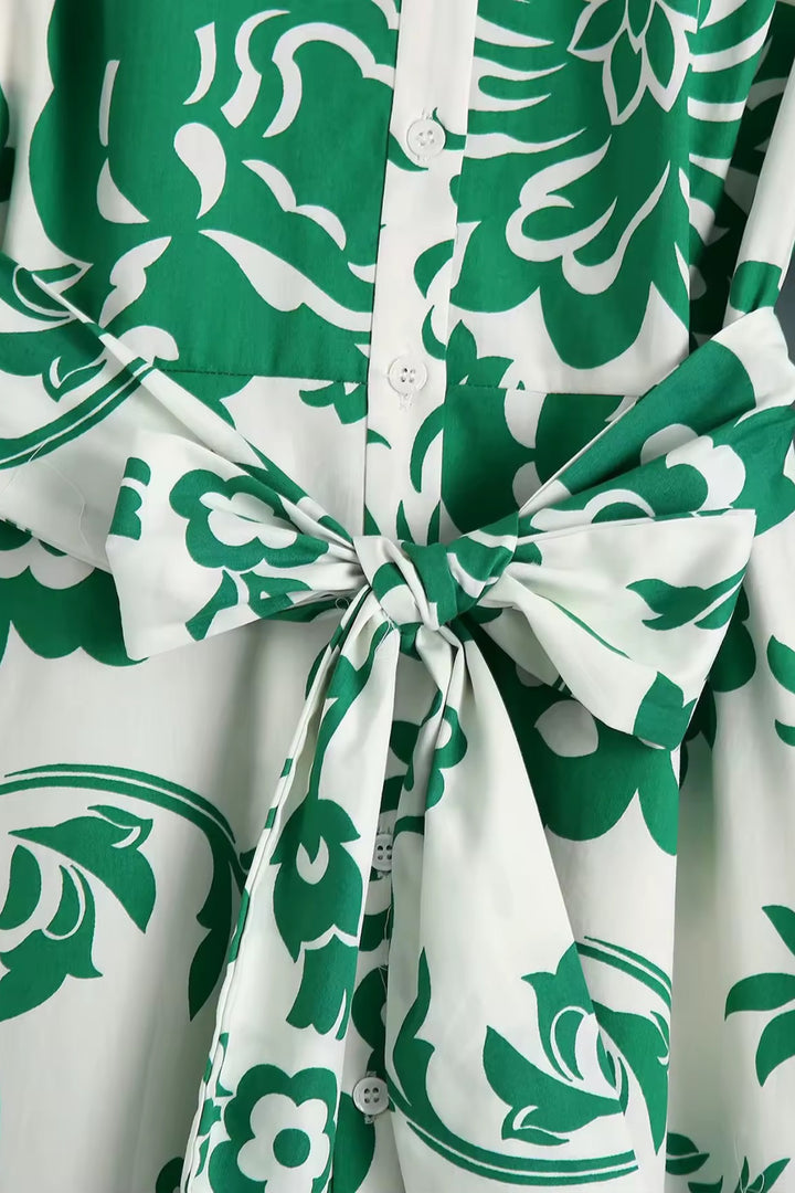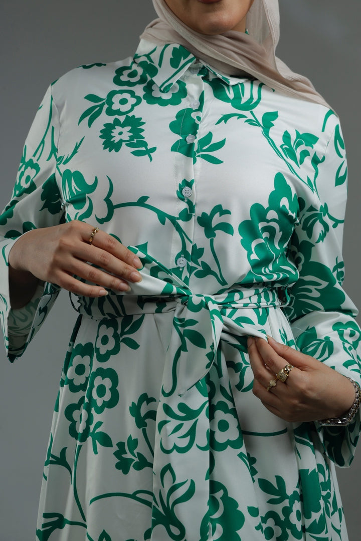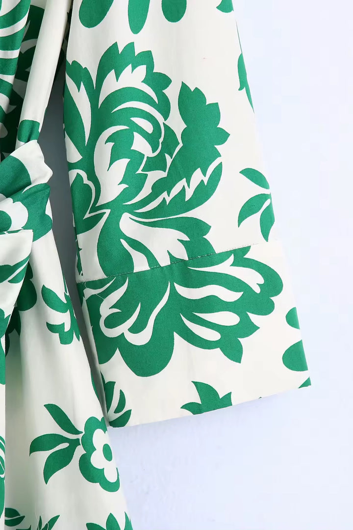 ELEGANT WRAP MIDI DRESS FEATURING A BLOD GREEN FLORAL PRINT ON A WHITE BASE