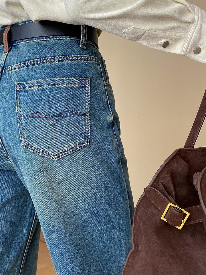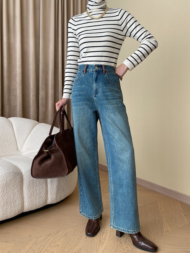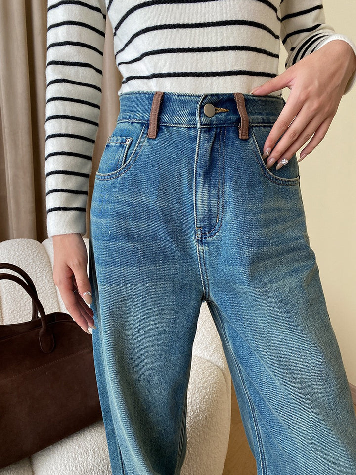 Classic high-waisted jeans with a flattering wide-leg cut. Features a vintage wash and a relaxed fit, perfect for a comfortable yet stylish look.