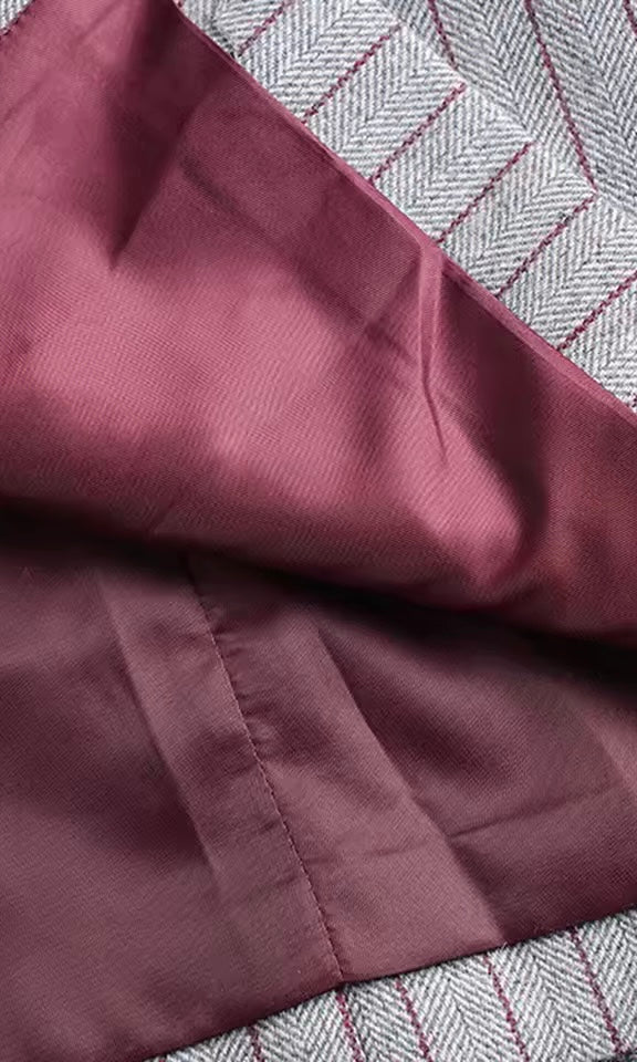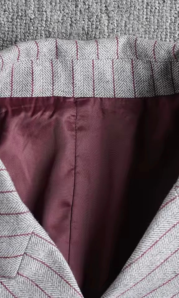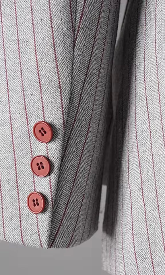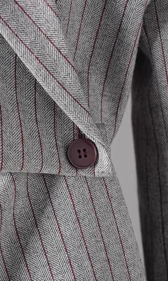 tailored pinstripe blazer with an asymmetric wrap design and single-button closure