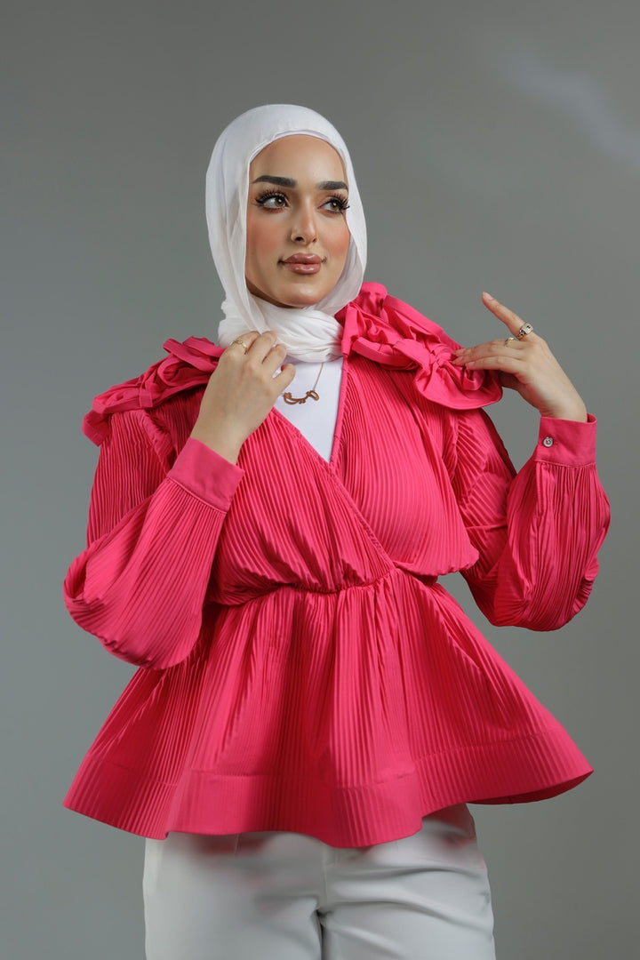 PLEATED WRAP SHIRT WITH RUFFLES AND PUFF SLEEVES