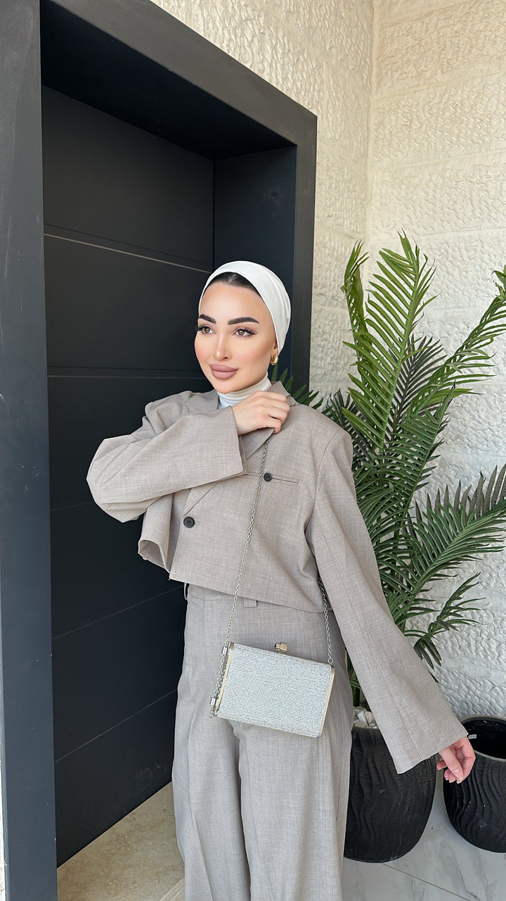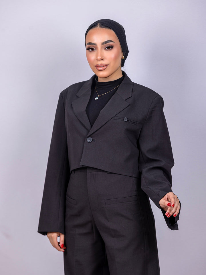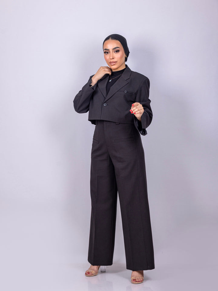 A modern two-piece set featuring a cropped blazer paired with wide-leg trousers.