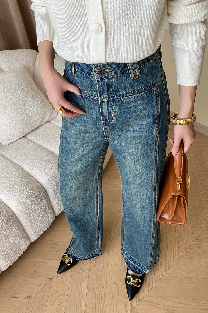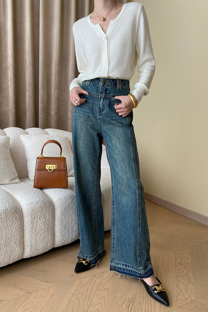 Trendy high-rise denim with a relaxed wide-leg fit and raw hem detail, adding a casual yet stylish touch to everyday outfits.
