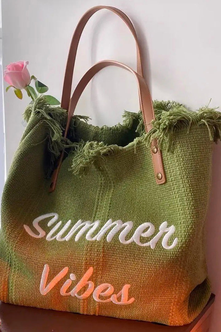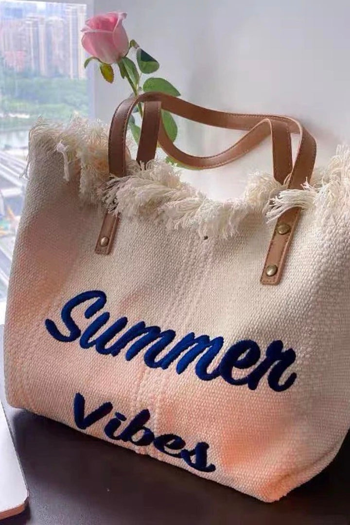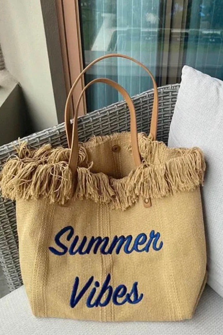 Stylish woven tote with fringe detailing and “Summer Vibes” embroidery, perfect for beach days, picnics, and sunny outings.