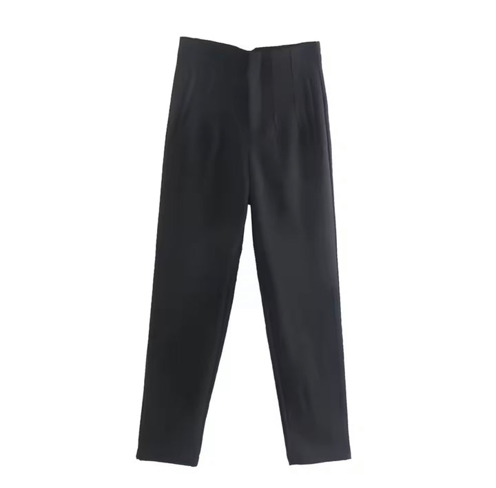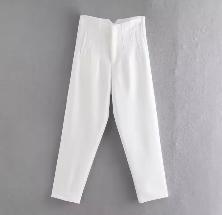 Elegant ankle-length pants with a slim fit and a distinctive scalloped, wave-like hem. Features intricate lace or eyelet detailing down the side seams for a delicate, refined look.